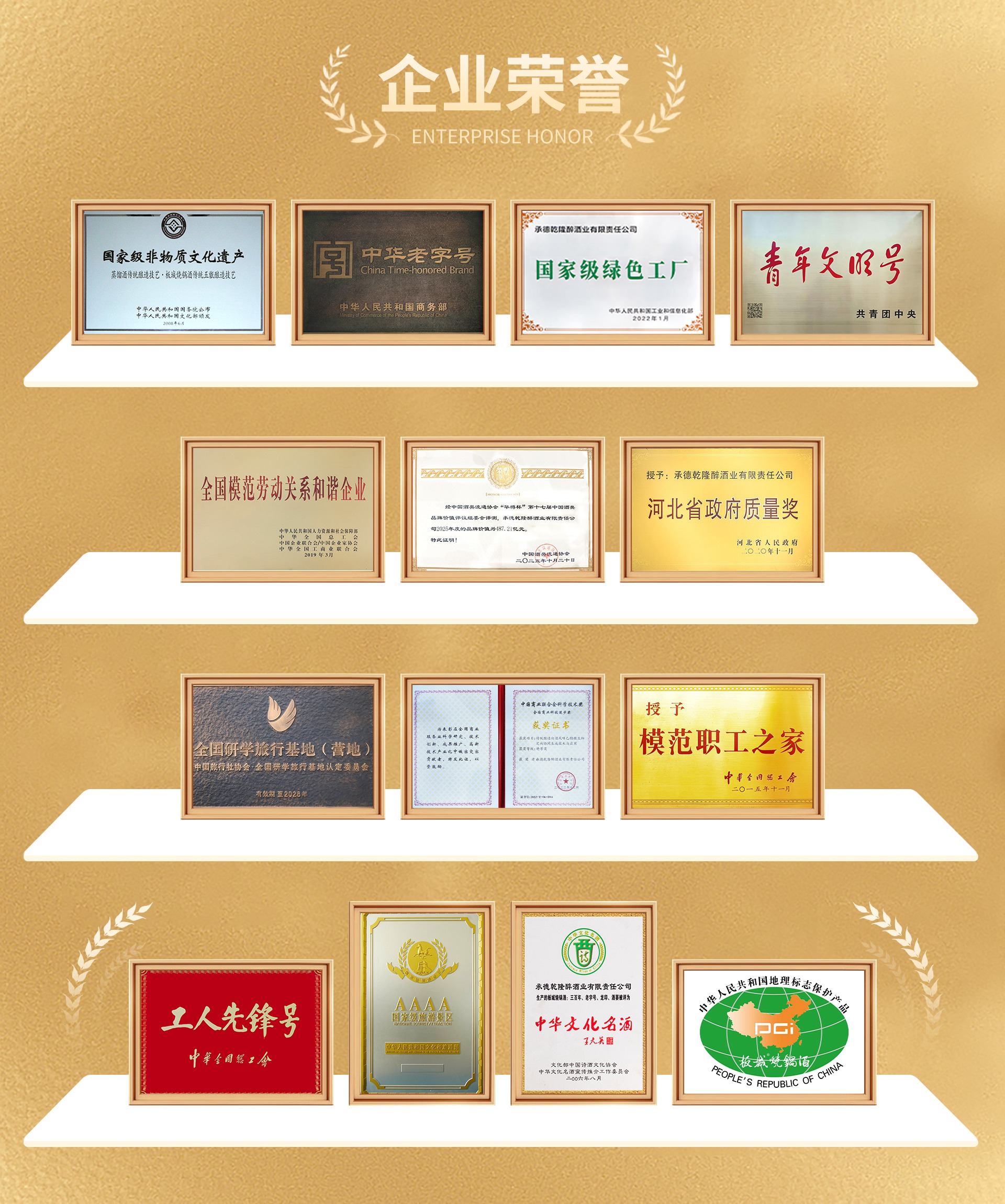 企業(yè)快速發(fā)展的同時(shí),也贏得了社會(huì)的廣泛贊譽(yù)。公司擁有國(guó)家專利8項(xiàng),注冊(cè)商標(biāo)124個(gè),先后榮獲“中華老字號(hào)”、“國(guó)家級(jí)非物質(zhì)文化遺產(chǎn)”、“國(guó)家地理標(biāo)志保護(hù)產(chǎn)品”、“國(guó)家級(jí)綠色工廠”、“中華文化名酒”、“全國(guó)模范職工之家”、“全國(guó)模范勞動(dòng)關(guān)系和諧企業(yè)”、“國(guó)家級(jí)青年文明號(hào)”、“全國(guó)工人先鋒號(hào)”“國(guó)家AAAA級(jí)景區(qū)”、“河北省政府質(zhì)量獎(jiǎng)”“第十五屆“華樽杯”板城品牌價(jià)值449.82億元”等上百項(xiàng)榮譽(yù)。