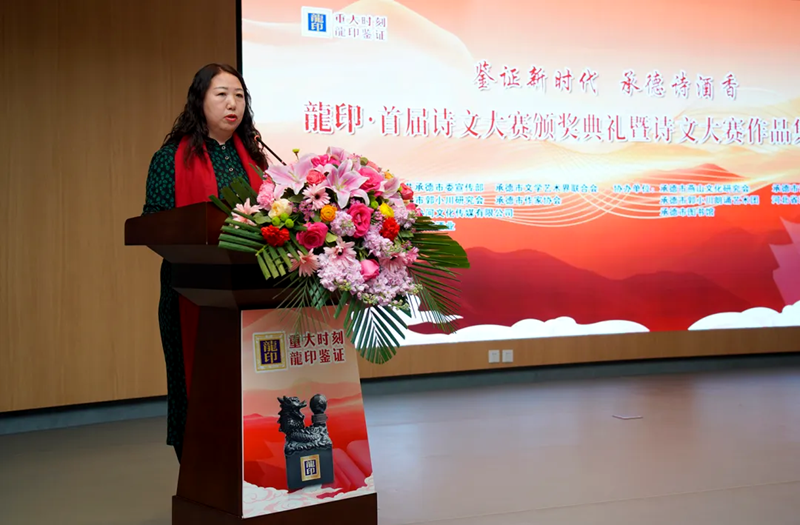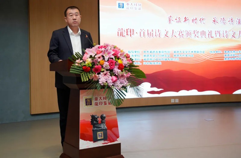承德市郭小川研究會(huì)會(huì)長(zhǎng)步九江發(fā)表致辭,“鑒證新時(shí)代 承德詩(shī)酒香——龍印·首屆詩(shī)文大賽”這場(chǎng)活動(dòng)參與人員之多,高手云集之密,采訪挖掘之深,作品質(zhì)量之高,在承德文學(xué)史上尚屬首次。
