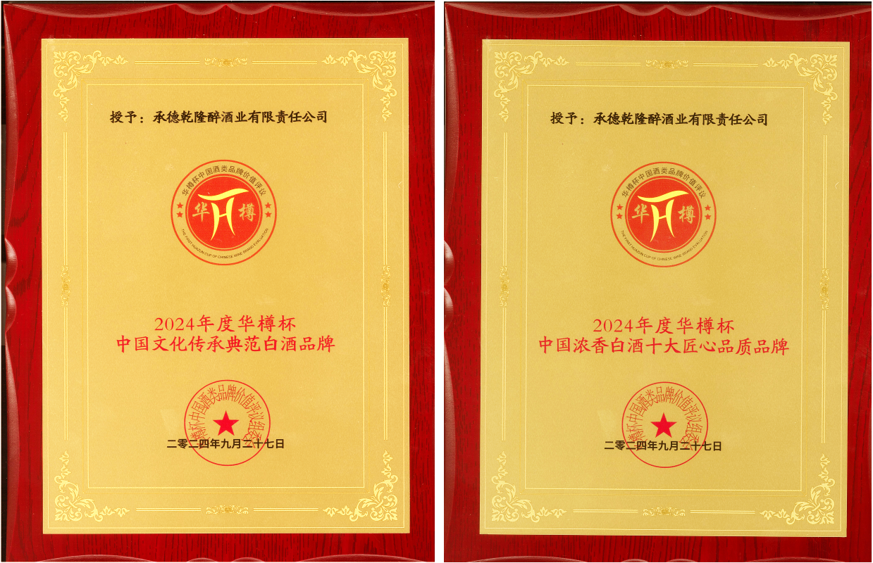 板城酒業(yè)憑借過硬的綜合實力得到行業(yè)肯定及評審專家的認可,經(jīng)中國酒類流通協(xié)會“華樽杯”第十六屆中國酒類品牌價值評議組委會評測,承德乾隆醉酒業(yè)有限責任公司(板城酒業(yè))2024年度的品牌價值為449.82億元,中國白酒行業(yè)排名三十位,同時,榮獲“2024年度華樽杯中國濃香白酒十大匠心品質(zhì)品牌”、“2024年度華樽杯中國文化傳承典范白酒品牌”獎項,充分彰顯了冀酒的品質(zhì)自信,也傳遞出行業(yè)、社會對板城酒業(yè)品牌文化的高度認可。