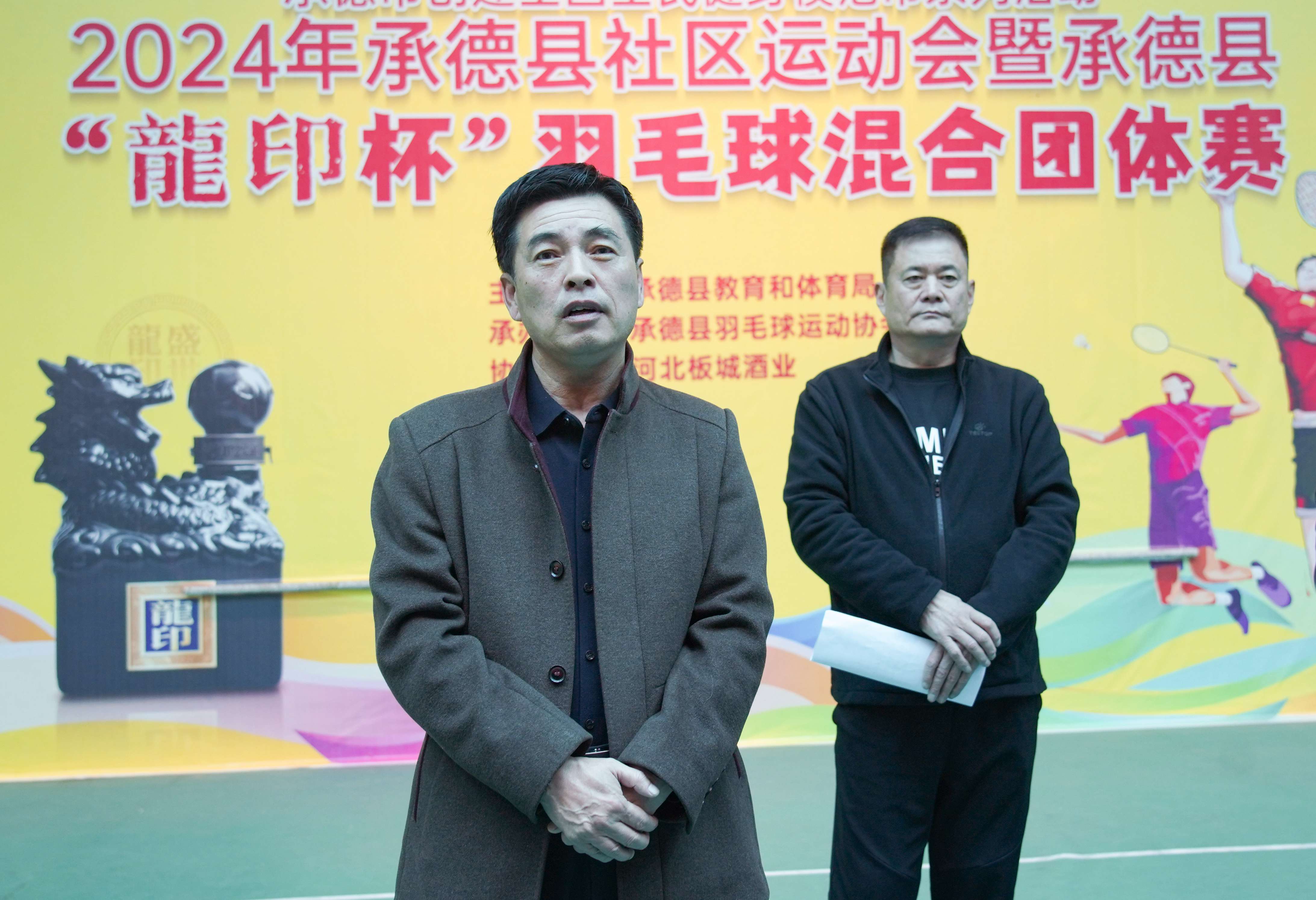 承德縣教育和體育局黨組成員朱瑞東,承德縣羽毛球協(xié)會(huì)會(huì)長(zhǎng)張景玲,秘書長(zhǎng)李樹(shù)立,板城酒業(yè)生產(chǎn)總經(jīng)理趙志剛,工會(huì)主席唐振福,釀酒中心總監(jiān)王金成,承德戰(zhàn)區(qū)縣區(qū)龍印部區(qū)域經(jīng)理陶景奇,承德縣龍印部業(yè)務(wù)經(jīng)理郭俊杰出席本次活動(dòng)。承德縣羽毛球協(xié)會(huì)會(huì)長(zhǎng)張景玲主持開(kāi)幕式活動(dòng)。